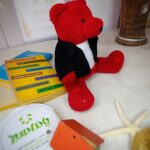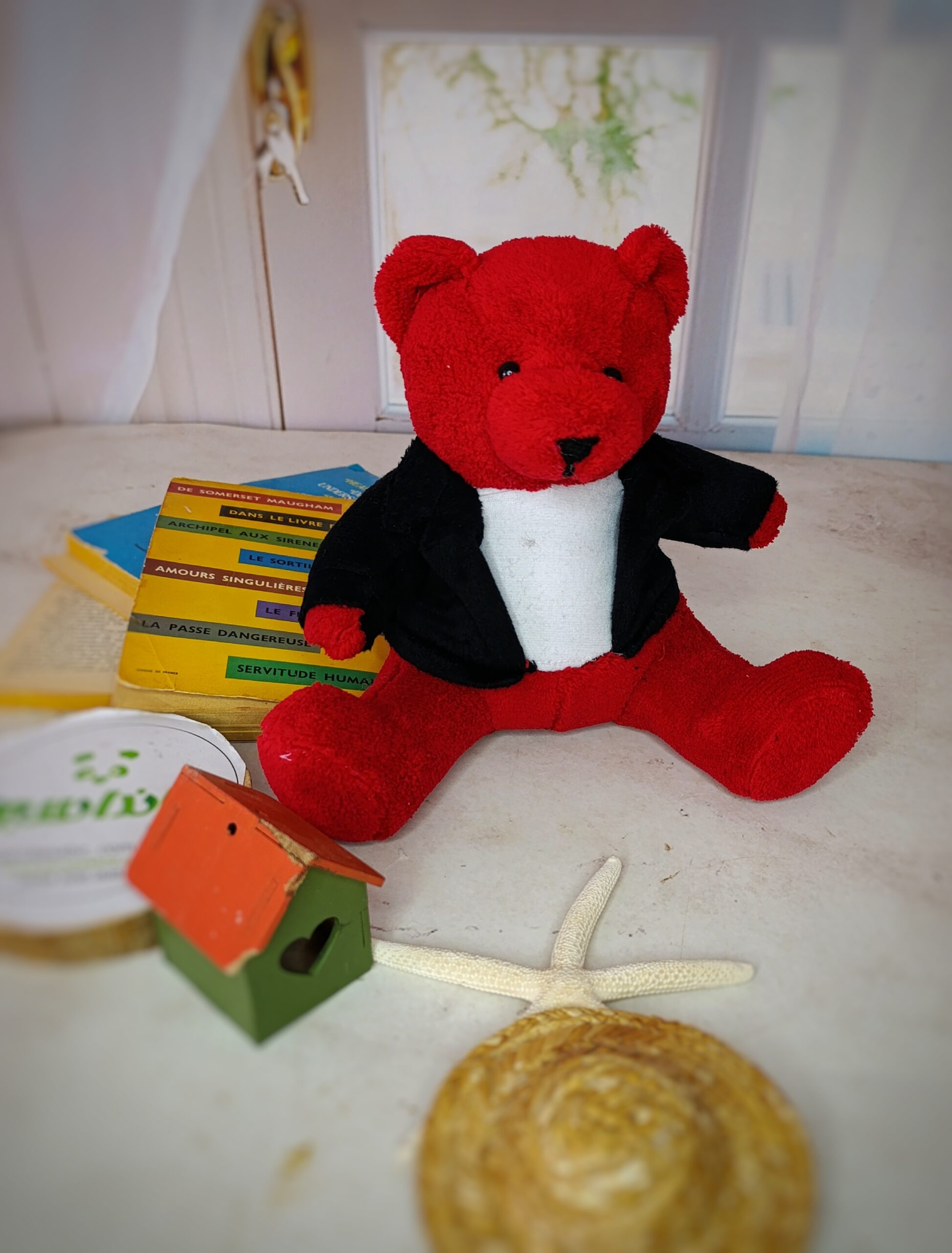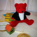 عروسک خرس قرمز با کت مشکی